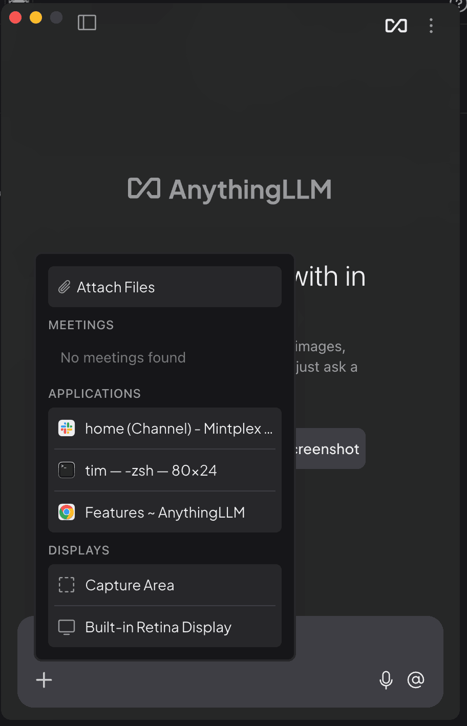 All chat functionality in the Desktop Assistant is the same as in the main AnythingLLM UI. You can use the same tools and features to chat with the Desktop Assistant.