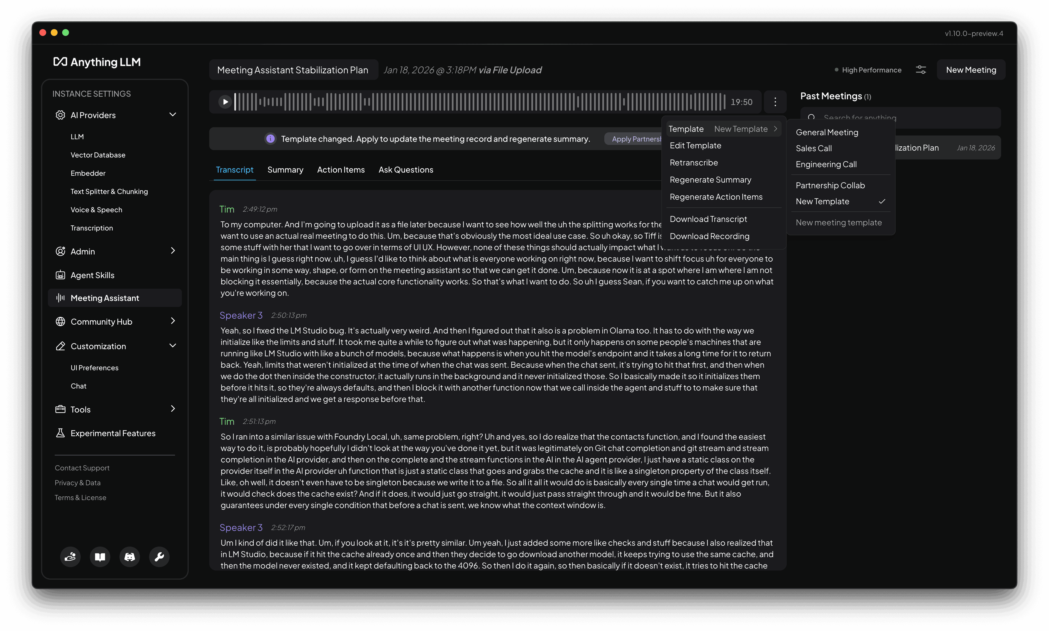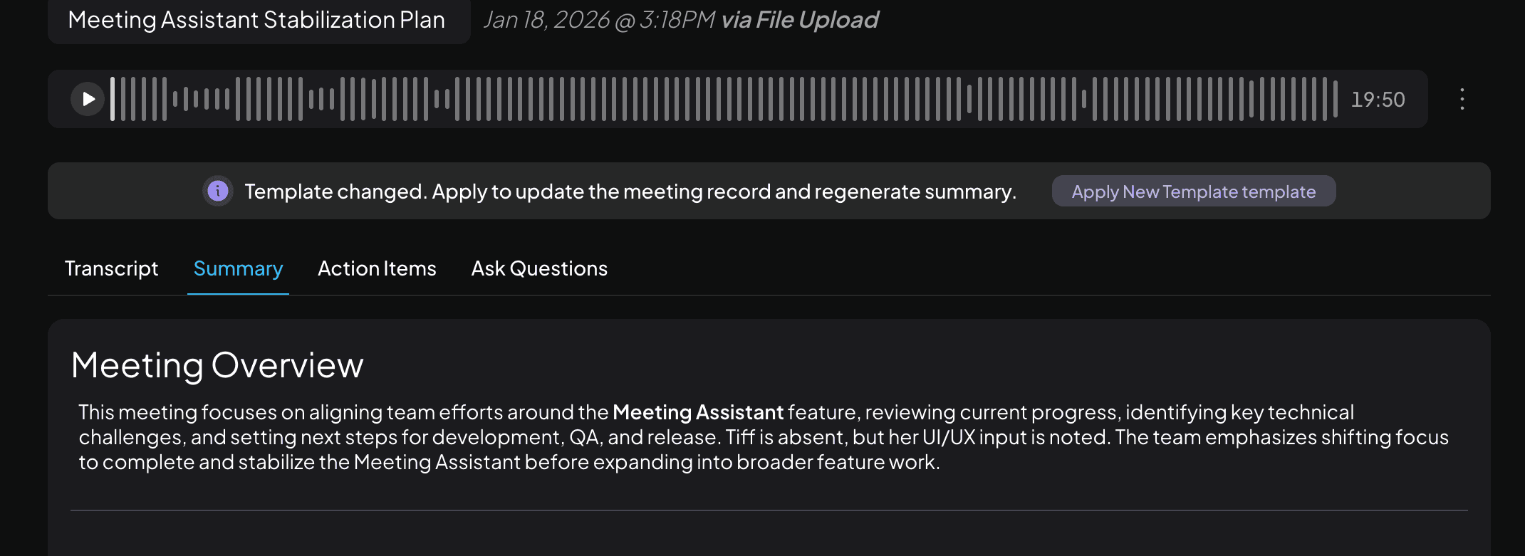 If you change the summary template for a meeting you can instantly apply it to the meeting summary by clicking the "Apply Summary Template" action at the top of the meeting summary. This will apply the summary template to the meeting summary that will be sent to your LLM for processing.