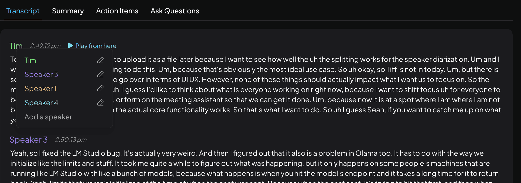 The Meeting Assistant is able to identify unique speakers in the transcript. It does not rename the speakers in the transcript based on your meeting, it simply identifies them by their unique voice characteristics. This process is done using a combination of LLM-based speaker identification and speaker diarization. That being said, it is not perfect and may not always be able to identify speakers correctly.