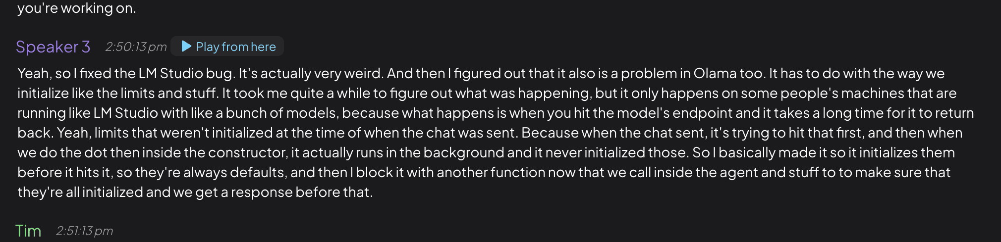 For any transcript, you can replay the audio from the top recording player as well as click to jump to a specific time in the transcript. If you have speaker identification enabled, you can also click on a speaker segment to jump to that exact time in the audio.