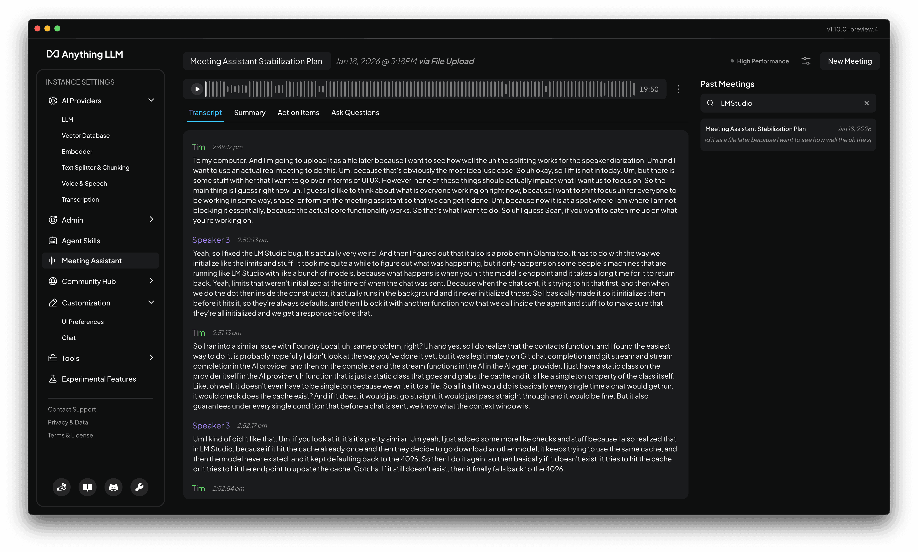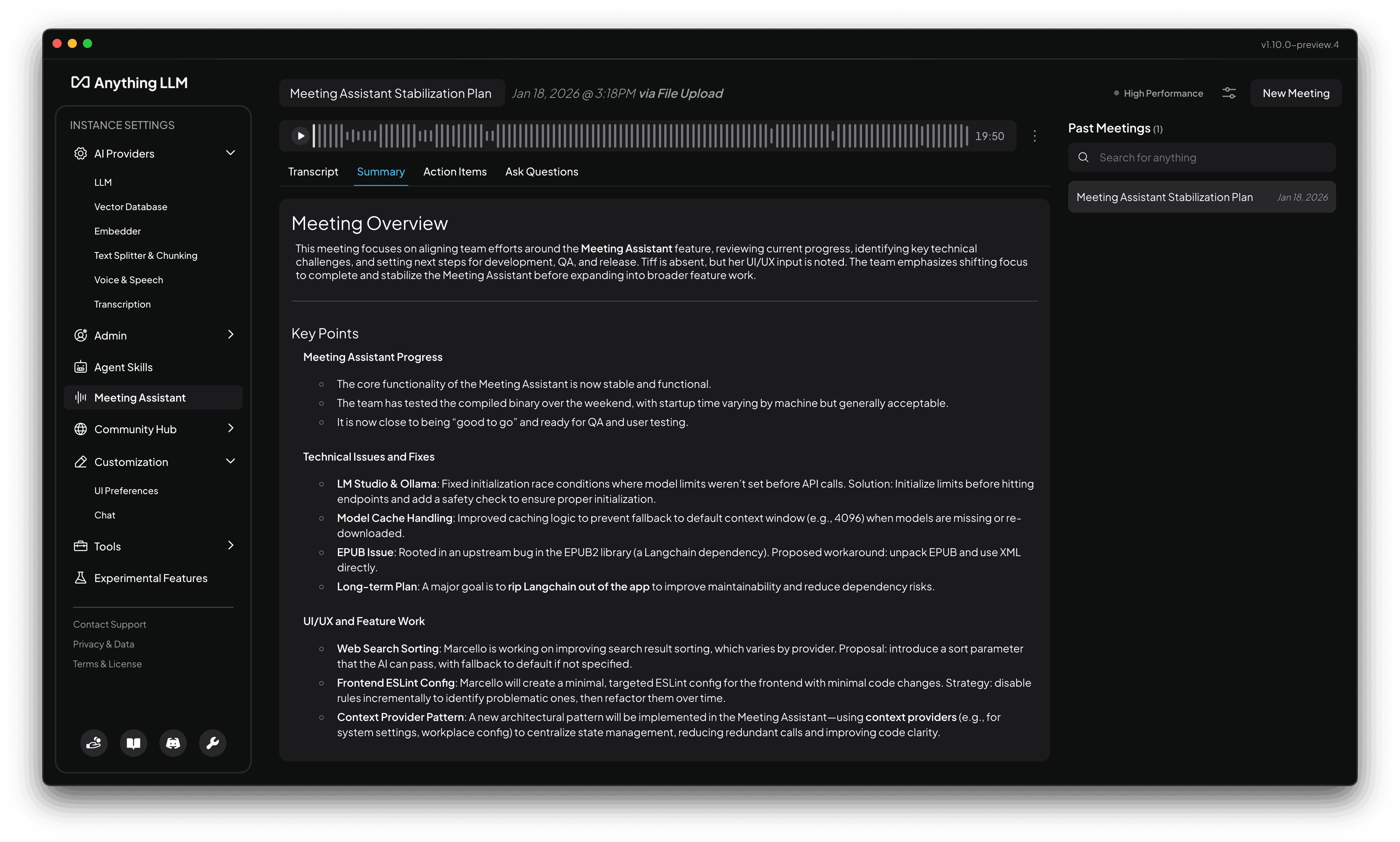 The Meeting Assistant is able to summarize your meetings using your LLM provider and model of choice (Cloud or Local). By default, this is using whatever model you have configured as the "system" model in the AnythingLLM Settings > AI Providers > LLM.